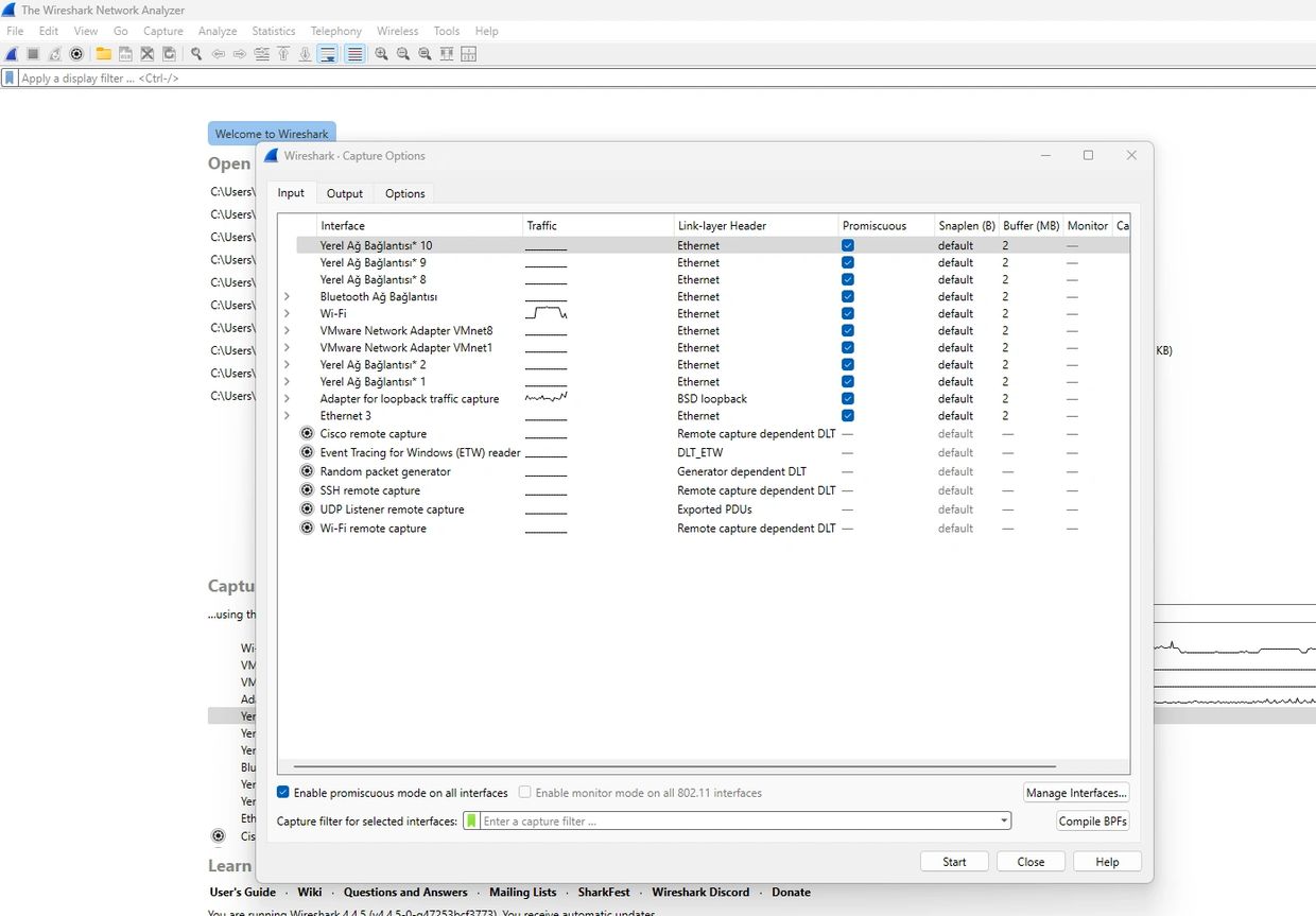 Wireshark sayesinde paket yakalamak için öncelikle ana menüden Capture -> Options yolunu takip ederek aşağıdaki menüye erişmek gerekmektedir. Buradan analiz etmek istediğimiz ağ kartını seçerek işleme başlayabiliriz. Ya da ilk açılan ekranda 6 numaralı kısımdan da yine seçimimizi gerçekleştirebiliriz.