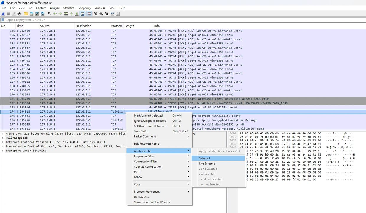 Wireshark kullanırken standart filtrelemeler dışında kendinize ait özel filtreler oluştumak isterseniz, wireshark size bu özelliği sunmaktadır. Bunu yapabilmek için filtrelemek istediğiniz durumun üzerine sağ tış yapıp, “Apply as Filter” demeniz ve çıkan durumlardan birini kendinize göre seçmeniz yeterli olacaktır. Görseldeki gibi "TLSv1.2" ye sağ tıklayıp açılan sekmede "Apply as Filter-->Selected" diyerek TLSv1.2' yi filtrelemiş oluruz. Ya da tam tersi olarak "Apply as Filter-->Not Selected" diyerek de TLSv1.2 dışındakileri görüntüle diyebiliriz.
