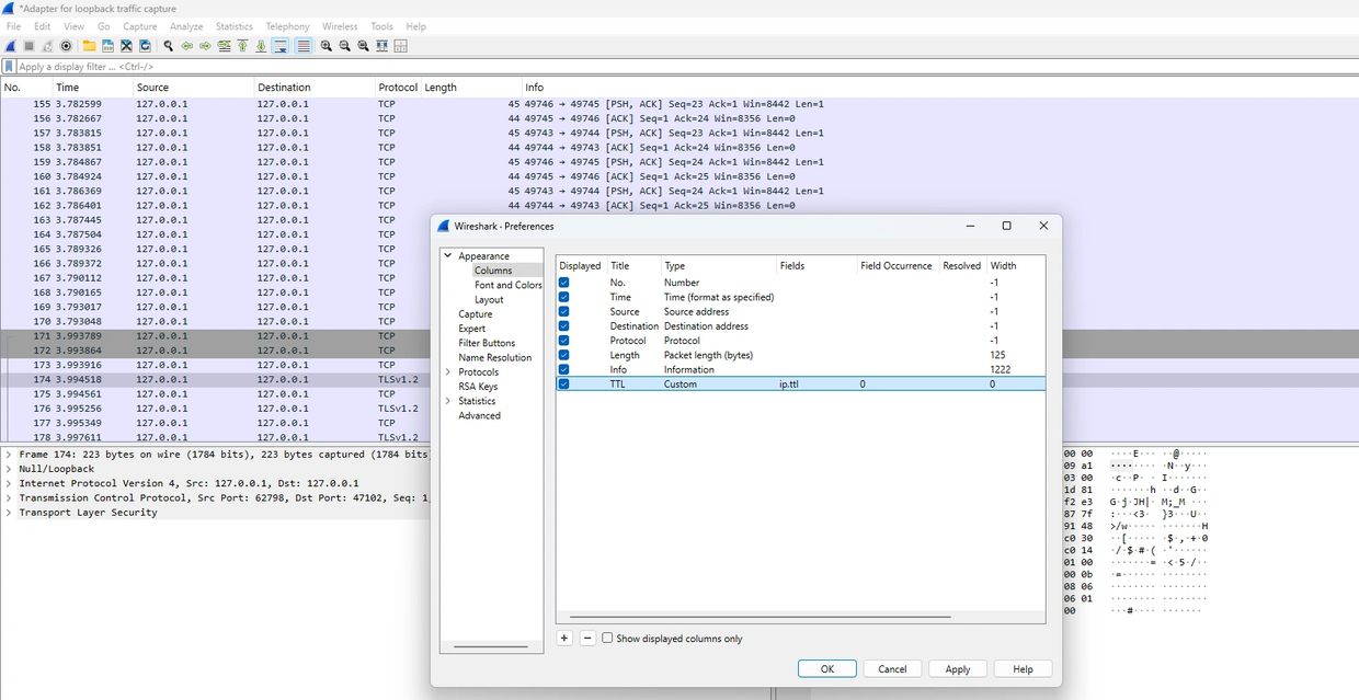Yine Wireshark kullanırken standart kolonlar (No, Time, Source vs...) yerine kendi tercihimize göre özel kolonlar da ekleyebiliriz. Bunun için ana menüden "Edit-->Preference" yolunu takip edip açılan ekranda "Columns" ekranında + butonu ile yeni bir kolon ekleyebiliriz. Örneğin Title TTL diyip fields kısmına ip.ttl dedikten sonra Apply--Ok diyerek yeni kolonu oluşturmuş oluruz.
