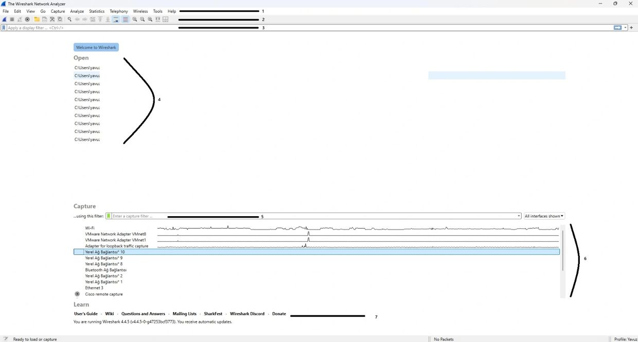 İlk olarak kurulum sonrası wireshark ekranı açılınca hangi kısım ne amaçla kullanılıyor onu bilmemiz gerekiyor.