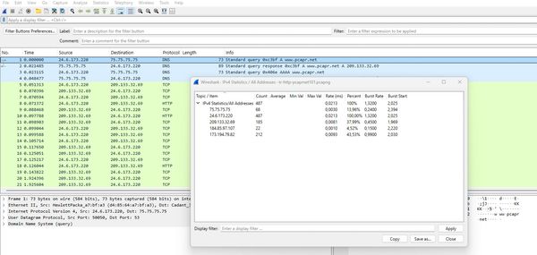 Bu kısımda IP adreslerinin trafik içerisinde kaç defa geçtiğini bulabilirsiniz. Display Filter kısmından da bir filtre belirtip hangi ip adreslerinin o filtrede geçerli olduğunu bulabilirsiniz.