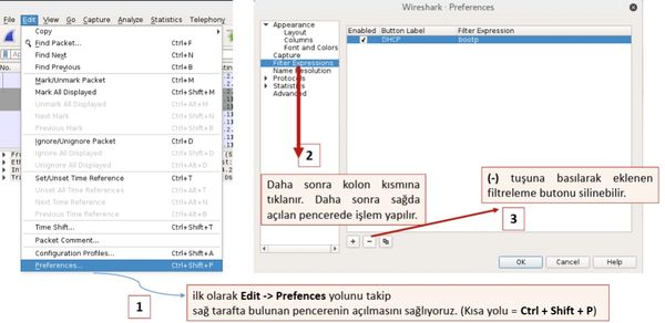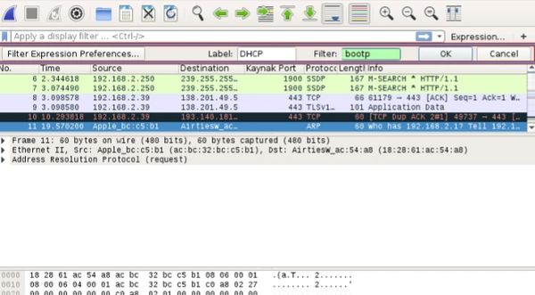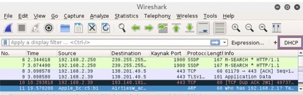Yapılan işlemler sonunda görünüm kutucuk içine alınan kısım gibi olacaktır. Artık DHCP isminde ve dhcp paketlerini filtreleyen bir filtreleme butonumuz olmuştur.