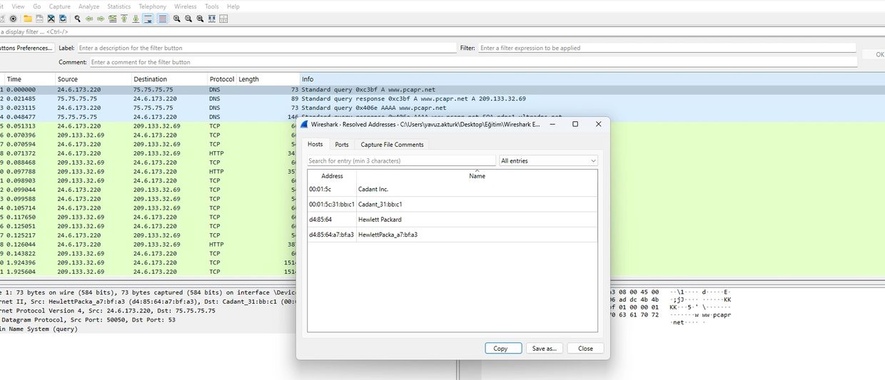 Yakalanan paketlerin tamamı için bir adres çözümleme yapmak istersek Statistics-> Resolved Addresses yolunu takip etmemiz yeterli olacaktır.