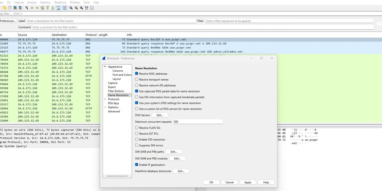 Wireshark –Adres Çözümlemenin Aktif Edilmesi: ilk olarak Edit -> Prefences yolunu takip sağ tarafta bulunan pencerenin açılmasını sağlıyoruz. (Kısa yolu = Ctrl + Shift + A) Daha sonra kolon kısmına tıklanır. Daha sonra sağda açılan pencerede işlem yapılır. Bu örnek için sadece MAC adresleri için adres çözümlemesini aktifleştirdik. Bu sayede artık MAC adreslerinin ilk 24 biti çözümlenecek ve üretici firmayı trafik içerisinde görebileceğiz. Aynı durum DNS için de geçerlidir.