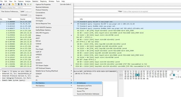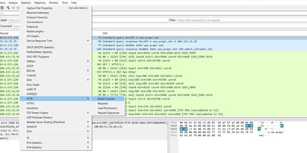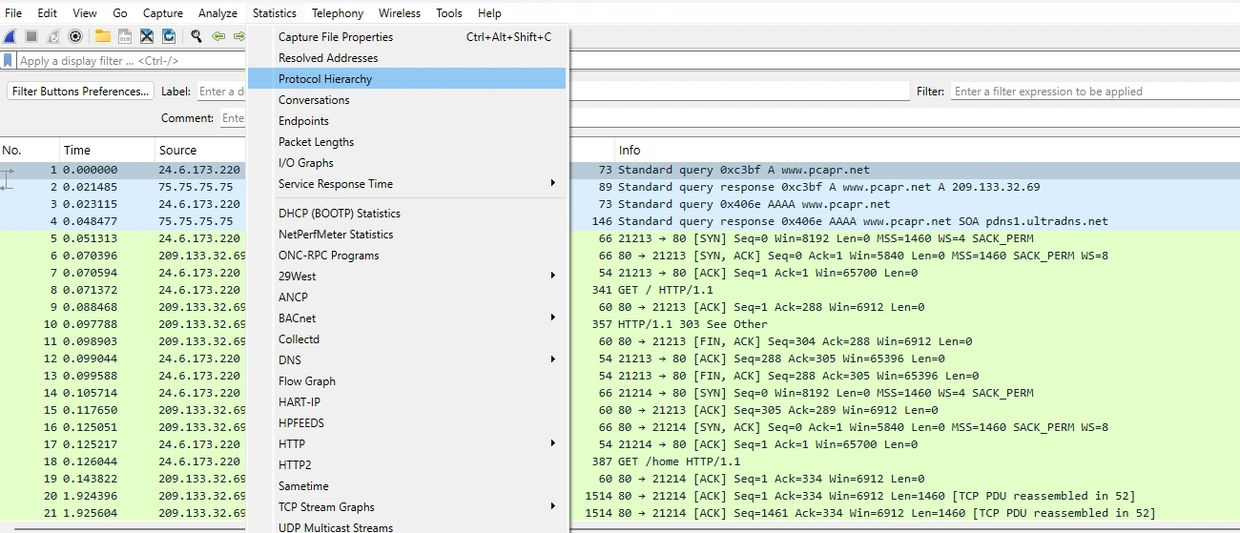 Statistics -> Protocol Hierarchy yolunu takip ederek açılır pencerede hangi protokolden kaç tane paket olduğunu görebilir ve istediğiniz bir protokol üzerine sağ tuş yapıp bir filtre uygulayabilirsiniz.