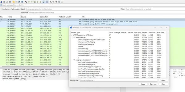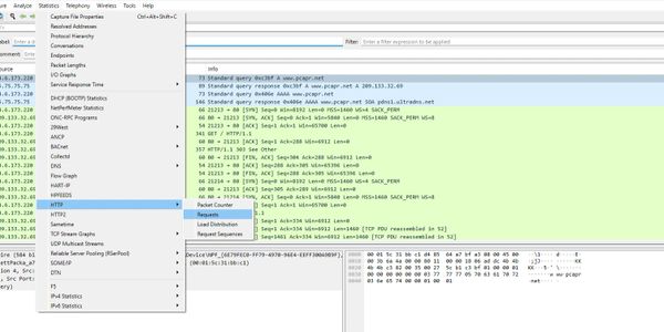 Eğer HTTP paketlerini analiz etmek ister isek: Statistics-> HTTP-> Requests yolunu takip ederek ziyaret edilen ve web site istatistiklerini görebilirsiniz.
