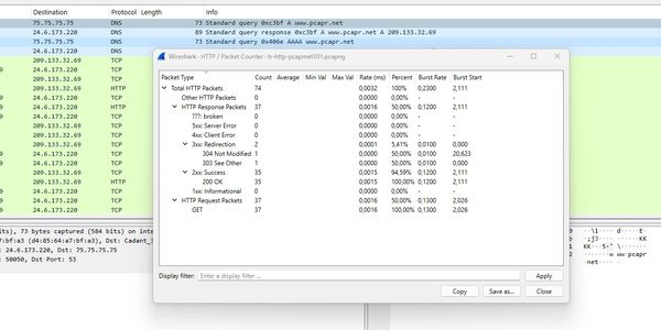 Statistics-> HTTP-> Packet Counter yolunu takip ederek HTTP Response Packet durumlarını analiz edebilirsiniz.